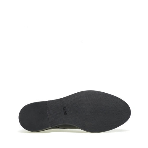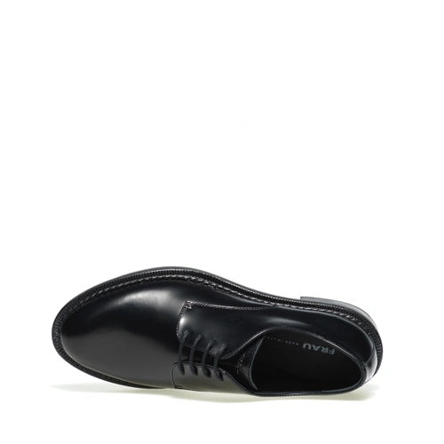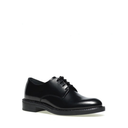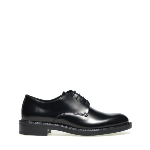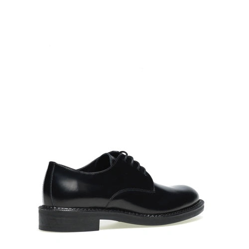 Stringata in pellame spazzolato nero con chiusura a derby e fondo in gomma.